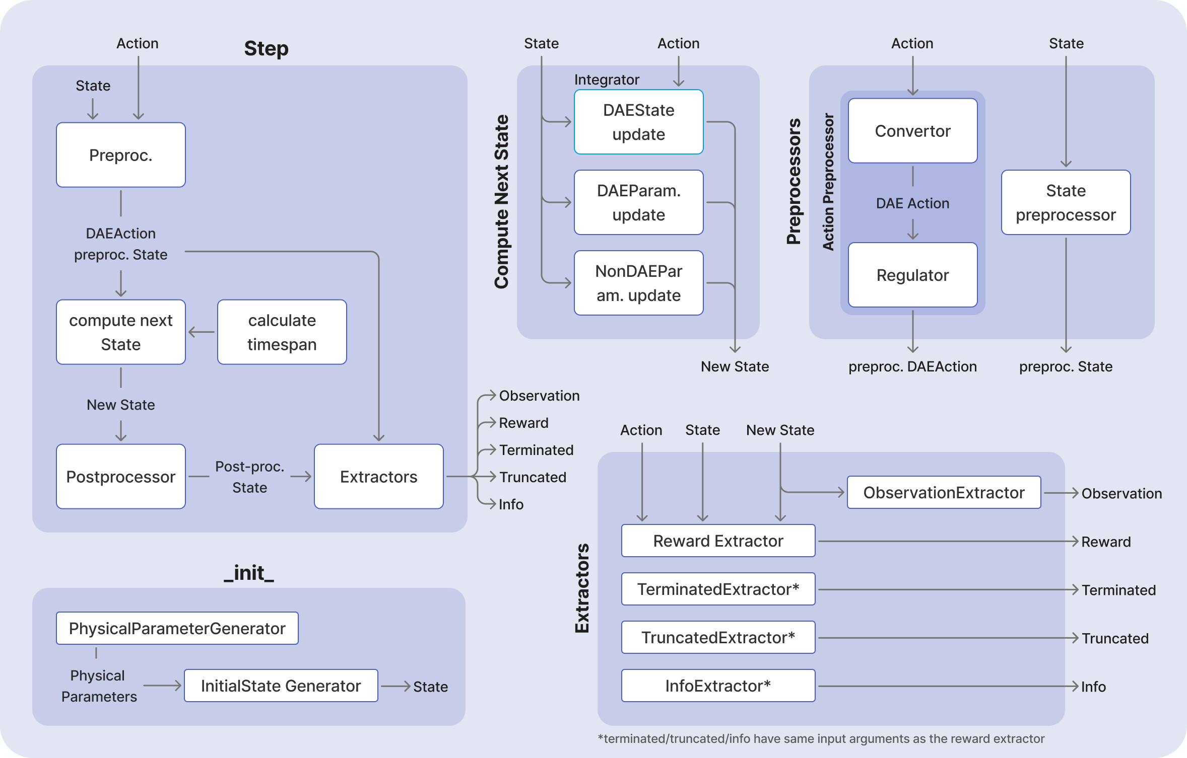 The main RL-related logics belong to __init__ and step functions. In the figure below, we have the implemented information flow in those two functions. The concrete implementation of the data types, e.g. State, and the abstract methods of the components like RewardExtractor requires knowledge the use-case.