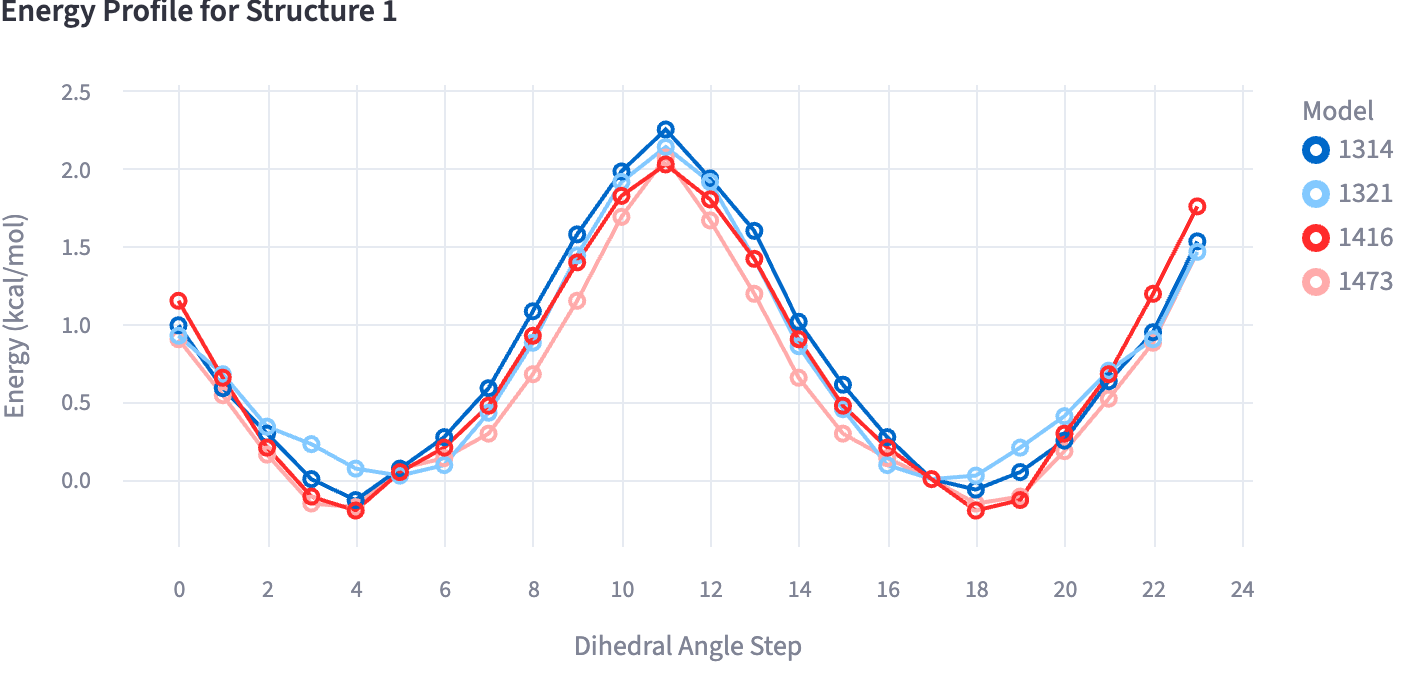 The correct representation of energetic barriers along conformational changes, like dihedral rotation, is important for simulation-based methods and also to correctly represent transition states of any reaction involving conformational changes. The MAE (Mean Absolute Error) and RMSE (Root Mean Square Error) should be as low as possible and match the expectations from training and testing of the energy inference. The Pearson correlation should be close to 1, but since energy differences between conformers along a dihedral scan may be small, this criterion can be considered a bit less strict than the criterion given for conformational sampling. The mean barrier height error should also be as low as possible and match the expectations about the MLIP’s energy inference.