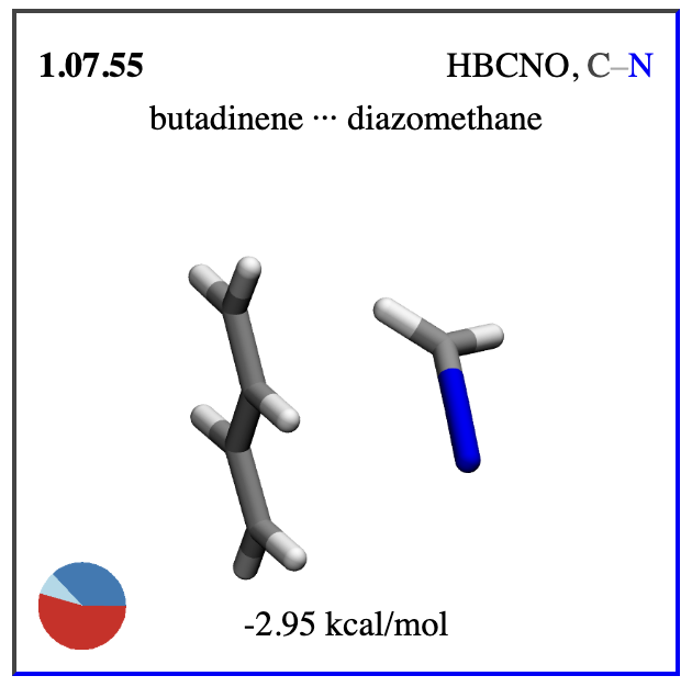 This benchmark tests if the MLIP can reproduce interaction energies of molecular complexes driven by non-covalent interactions. Non-covalent interactions are of highest importance for the structure and function of every biological molecule. This benchmark assesses a broad range of interaction types: London dispersion, hydrogen bonds, ionic hydrogen bonds, repulsive contacts and sigma hole interactions.