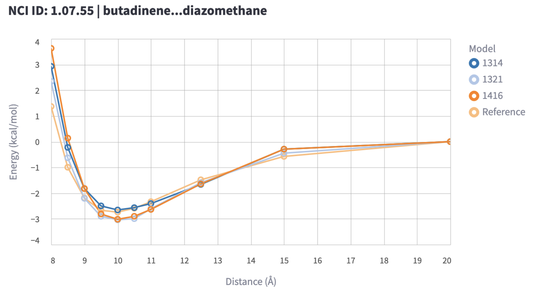 This benchmark uses the datasets from the NCI Atlas, with dissociation energy profiles. These datasets contain QM optimized geometries, along with CCSD(T)/CBS level interaction energies. The molecular complexes of these datasets contain typical organic small molecules, but also more exotic species and elements. Here is a summary of the datasets used in this benchmark:
